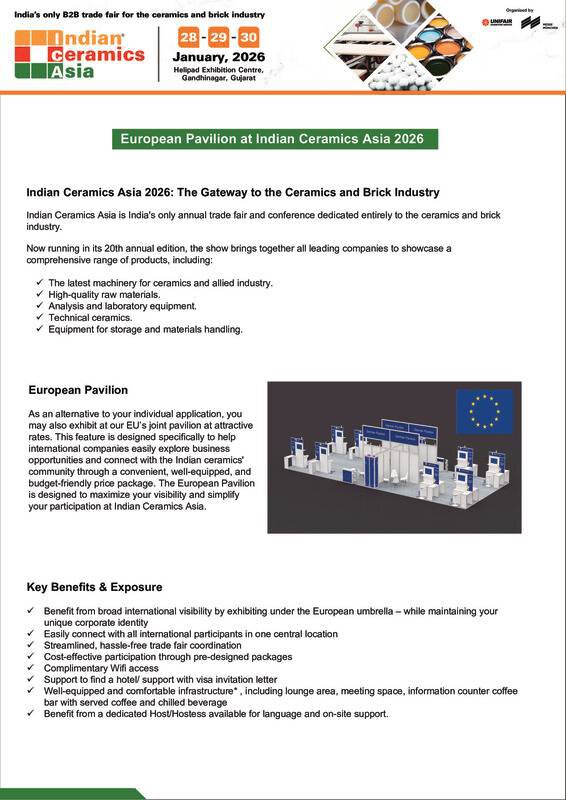 Der Europäische Gemeinschaftsstand auf der Indian Ceramics Asia 2026 bietet Unternehmen aus Europa eine exzellente Plattform, um ihre Innovationen, Technologien und Produkte einem internationalen Fachpublikum zu präsentieren – und das im Herzen eines der dynamischsten Wachstumsmärkte der Welt.